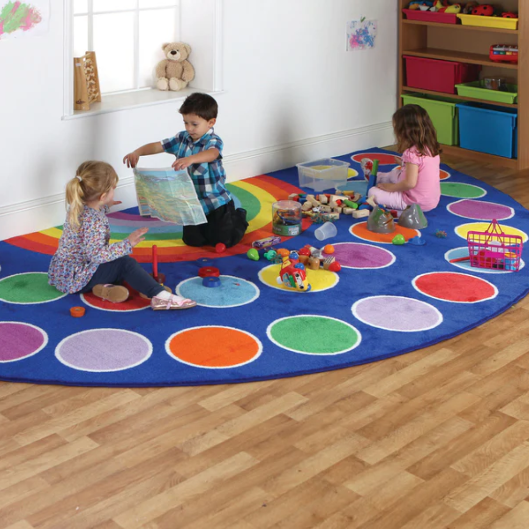 The Kit for Kids Rainbow Semi-Circle Rug offers a vibrant and interactive design with 24 student placement spots and a central rainbow teacher spot. This thick, soft, heavy-duty rug measures 400cm x 200cm, featuring a non-slip latex backing for added safety. Ideal for group activities, it combines comfort with durability.